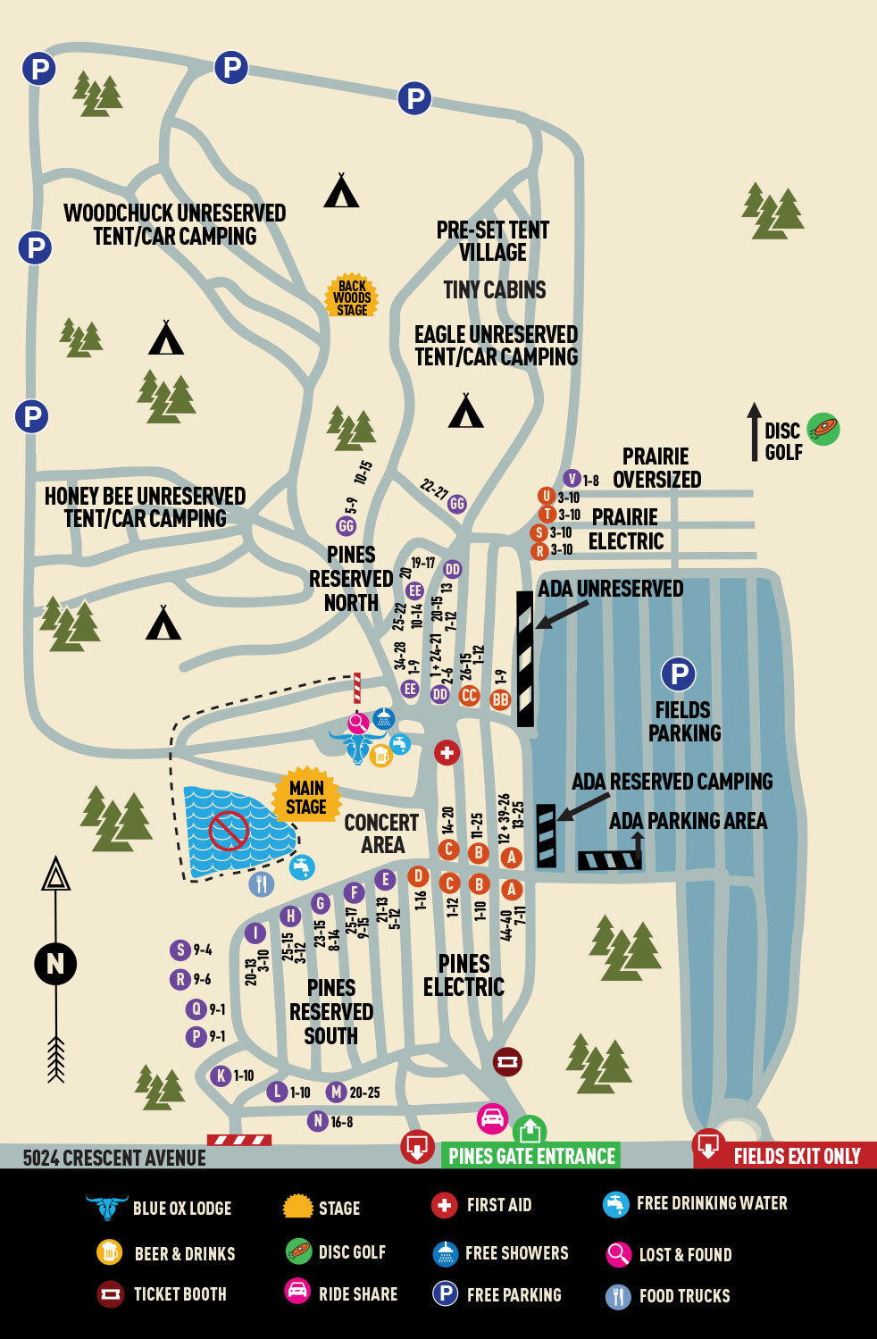 *Free early move-in on Thursday (Noon – 9pm) will be available to those with a Reserved Campsite (for up to 6 people), Pre-set Tent site (for up to 2 people) or Tiny Cabin (for up to 2 people), as long as each person staying at your site has a 2-day admission pass and everyone must arrive together with the reserved site ticket holder.